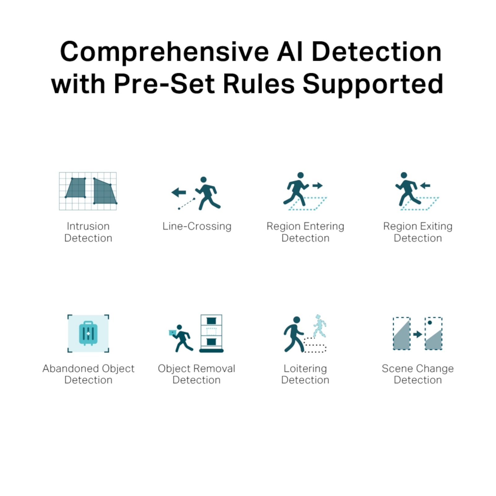 Detección inteligente. Reciba notificaciones y verifique las fuentes cuando alguien cruza un límite, ingresa a un área que ha establecido, obstruye la cámara o elimina/abandona objetos.