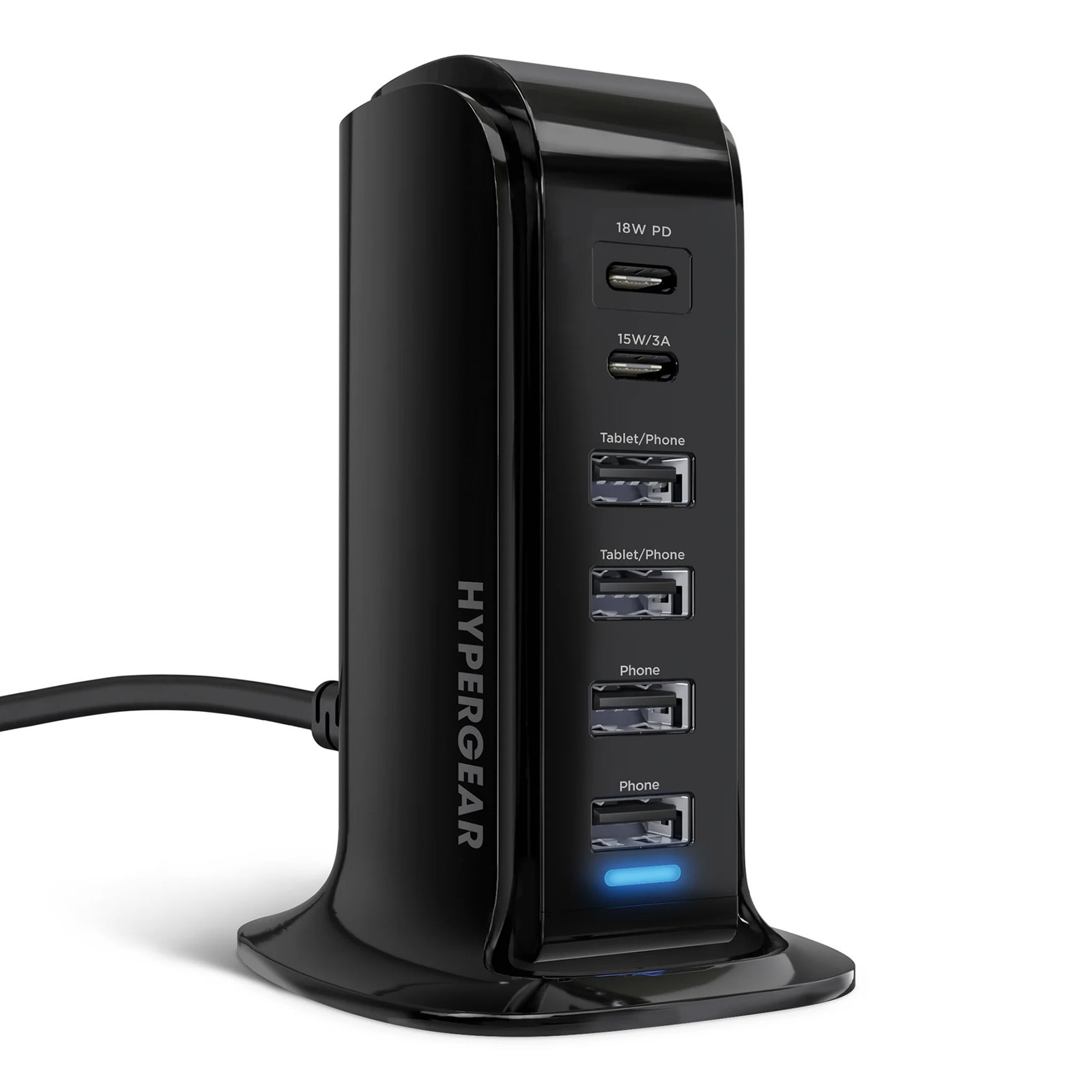 Power Tower es el cargador multidispositivo perfecto para computadoras de escritorio abarrotadas y hogares familiares con muchos dispositivos que necesitan una carga de alta velocidad constantemente. Con 6 puertos universalmente compatibles apilados en un diseño vertical que ahorra espacio, puedes cargar todo desde una elegante ubicación centralizada.