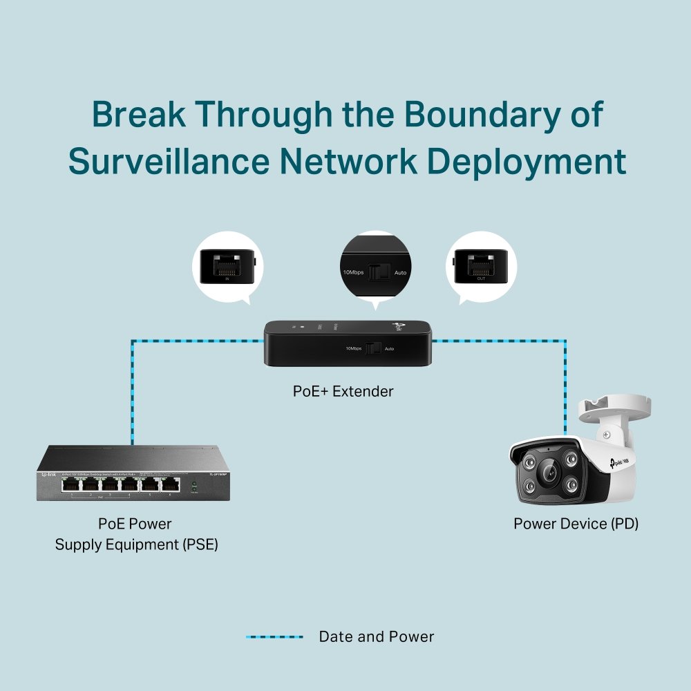El Extensor PoE+ Fast Ethernet TL-POE10E extiende una conexión de red PoE/PoE+ 100m – 250m adicionales (Modo 10 Mbps) desde el equipo fuente de alimentación PoE. El TL-POE10E amplía la implementación de la red con dispositivos compatibles con PoE 802.3af/at, lo que lo hace ideal para requerimientos de cableado remoto en escenarios de vigilancia. La distancia ya no será una barrera para la implementación de la red.