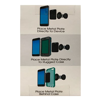 INCLUYE PLACA DE MONTAJE DE METAL (cuadrada) para colocar en la parte posterior del smartphone o estuche o entre ellos y así permitir adherirlo facilmente al soporte.