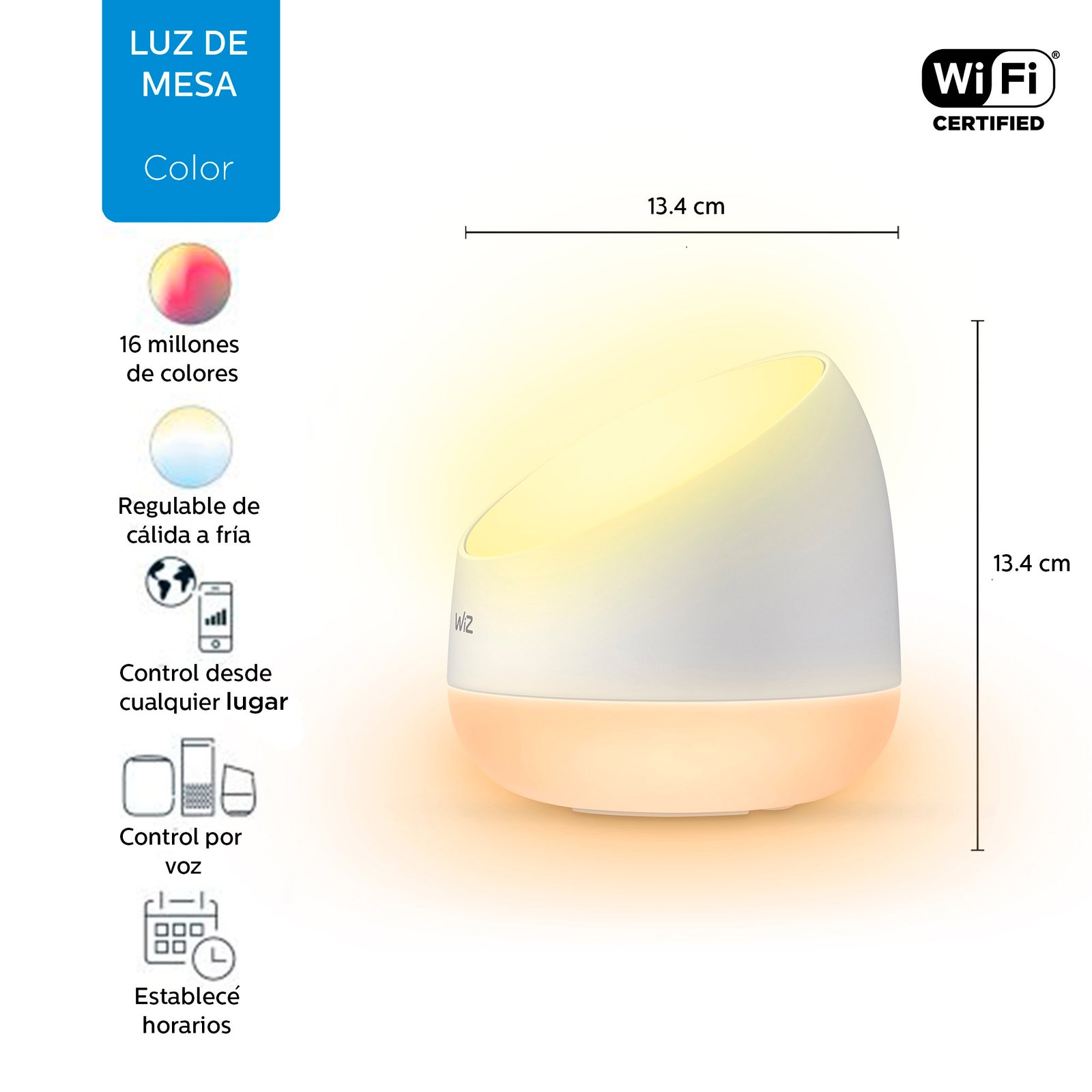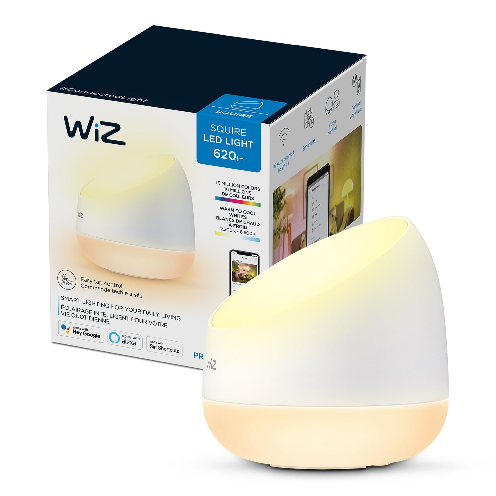 El diseño redondeado simple de la lámpara de mesa WiZ Squire te permite llevar una luz inteligente y colorida a cualquier rincón de tu hogar. Úsala con la aplicación WiZ o con tu voz para atenuar las luces e iluminar o usa los modos de iluminación prestablecidos en configuraciones WIFI.