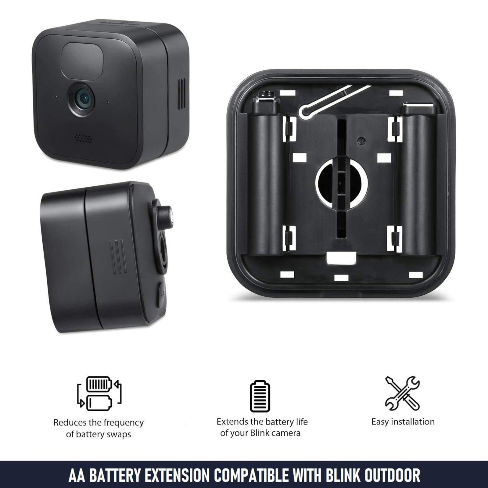 El paquete de extensión de batería Wasserstein te permite utilizar 4 pilas alcalinas AA con tu cámara Blink que proporciona un 100% más de duración de batería para tu cámara en comparación con 2 pilas AA.