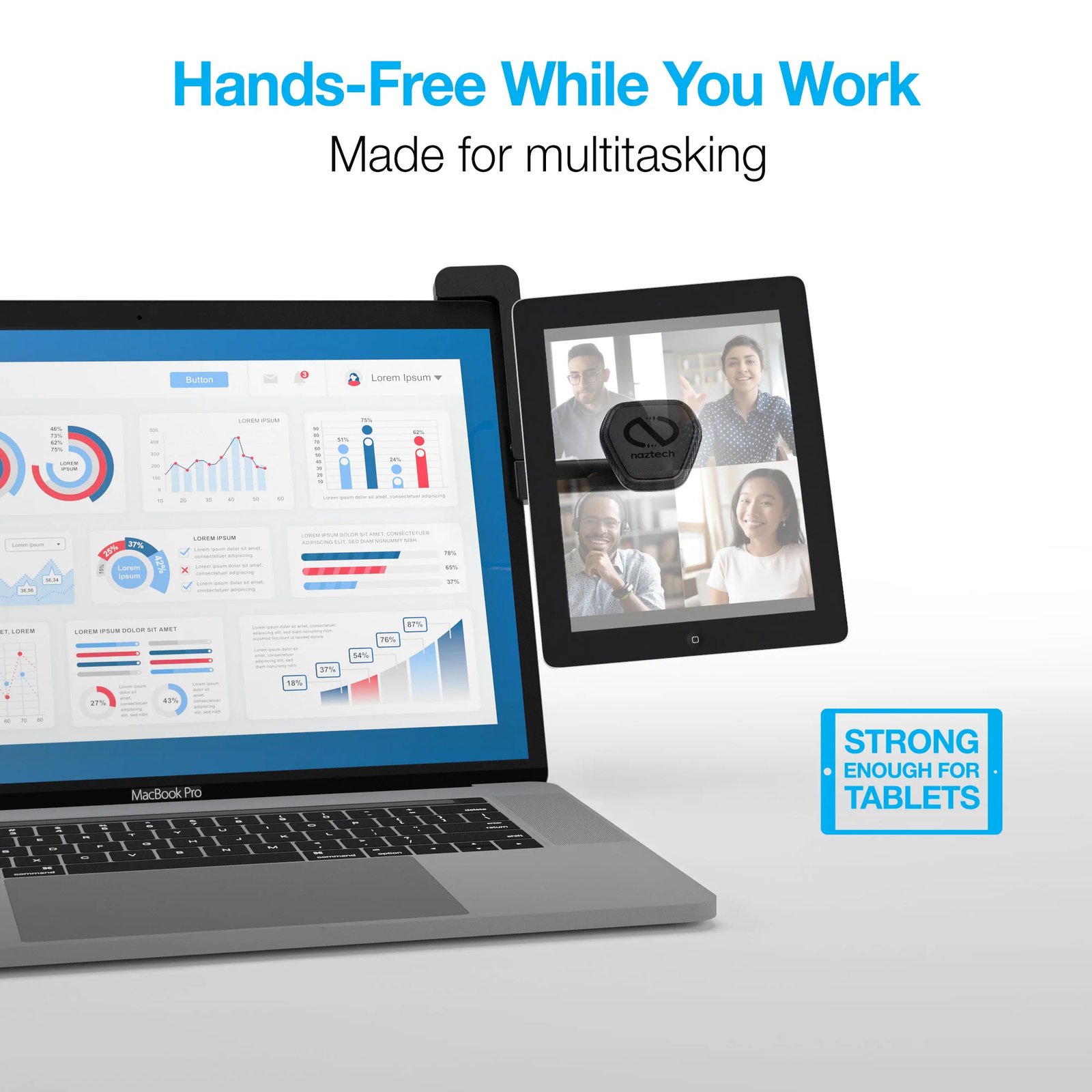 Elimina la tensión, no te encorves más! coloca tu información y aplicaciones al nivel de tus ojos y al alcance de tu mano. Monta tu dispositivo encima de la pantalla o a un lado y personaliza el ángulo de visión, para que puedas estar cómodo mientras trabajas.